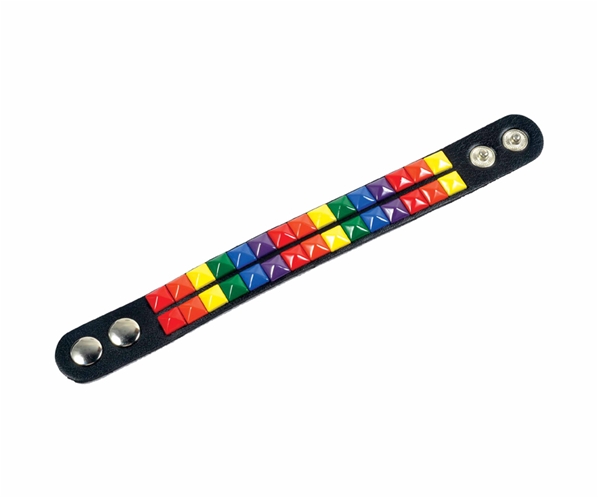 הצמיד שחור, עשוי מ PVC איכותי ועליו 2 שורות של ניטים 'פירמידה' קטנים בצבעי הקשת.