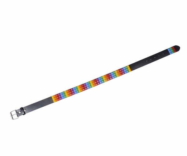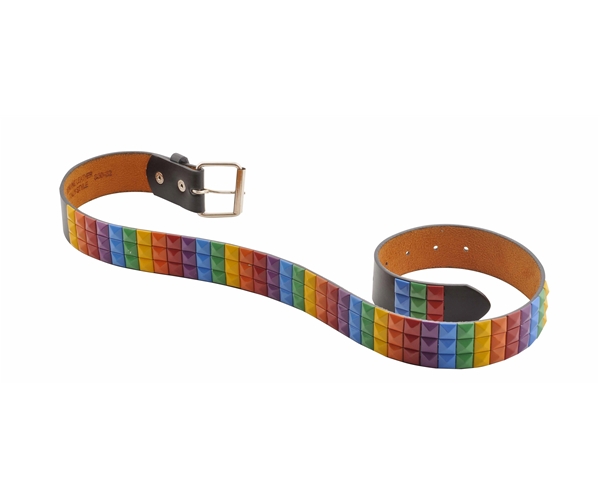 חגורת עור שחורה עם שורות של ניטים 'פירמידה' בצבעי הקשת.