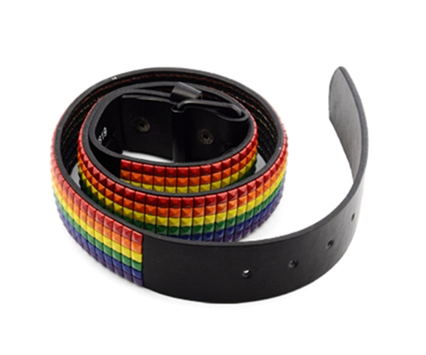 חגורת עור שחורה עם 6 שורות של ניטים פירמידות בצבעי דגל הקשת.