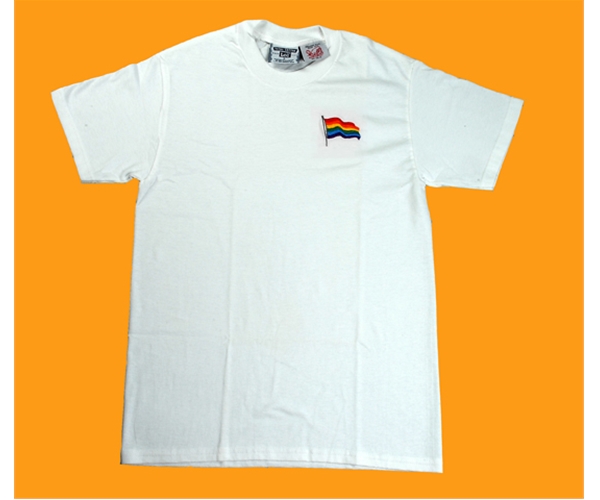 על גבי החולצה הלבנה רקום דגל בכל צבעי הקשת.