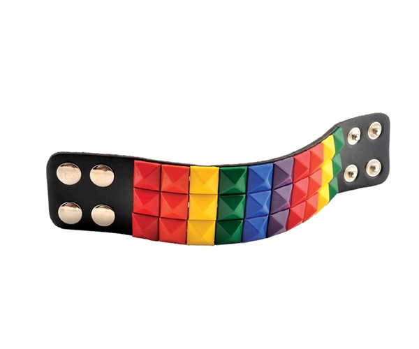הצמיד שחור, עשוי מ PVC איכותי ועליו שורה אחת של ניטים 'פירמידה' בצבעי הקשת.