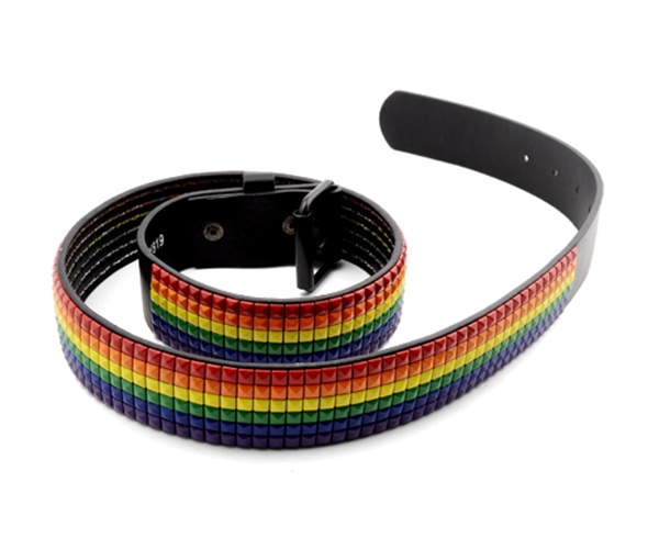חגורת עור שחורה עם 6 שורות של ניטים פירמידות בצבעי דגל הקשת.